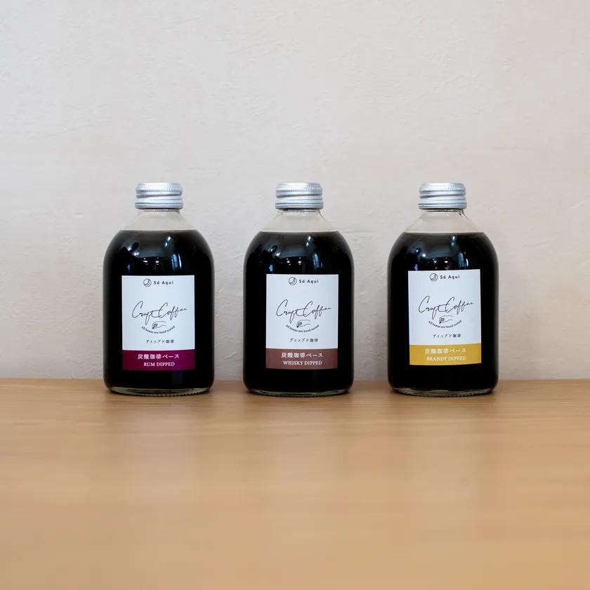 自家焙煎珈琲販売並びにトレーラーカフェを行うSo Aqui(ソーアキ)(所在地:滋賀県草津市、代表:瀬尾 亜妃子)は、栓を開けて炭酸水で割るだけで手軽に洋酒の香り漂う炭酸珈琲が楽しめるディップド珈琲炭酸珈琲ベース3種類の販売を開始しました。
