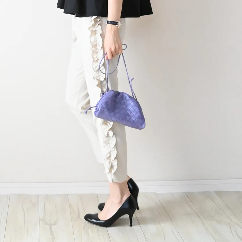 中でも定番人気のフリルパンツシリーズに新たに加わった待望の新作の「サイドフリルテーパードパンツ」はオンラインショップでも「遠目で見てもフリルが目立ってかわいいです。」「パンツ自体のシルエットはフリルポケットパンツと同じなので履きやすいです。」等のお喜びの声を多くいただいています。