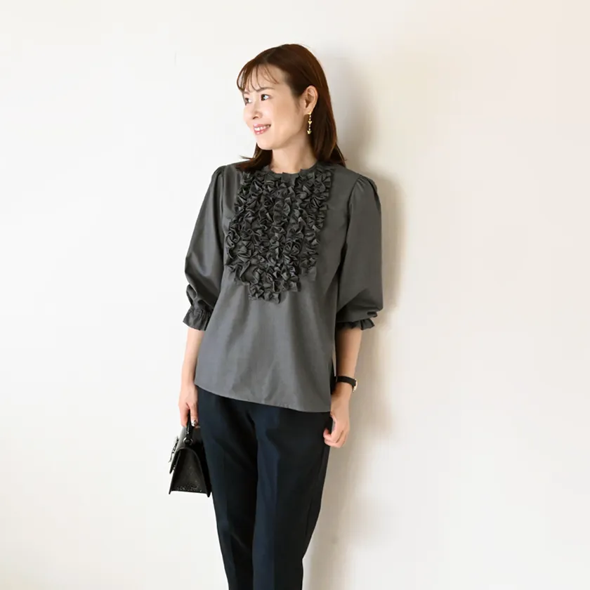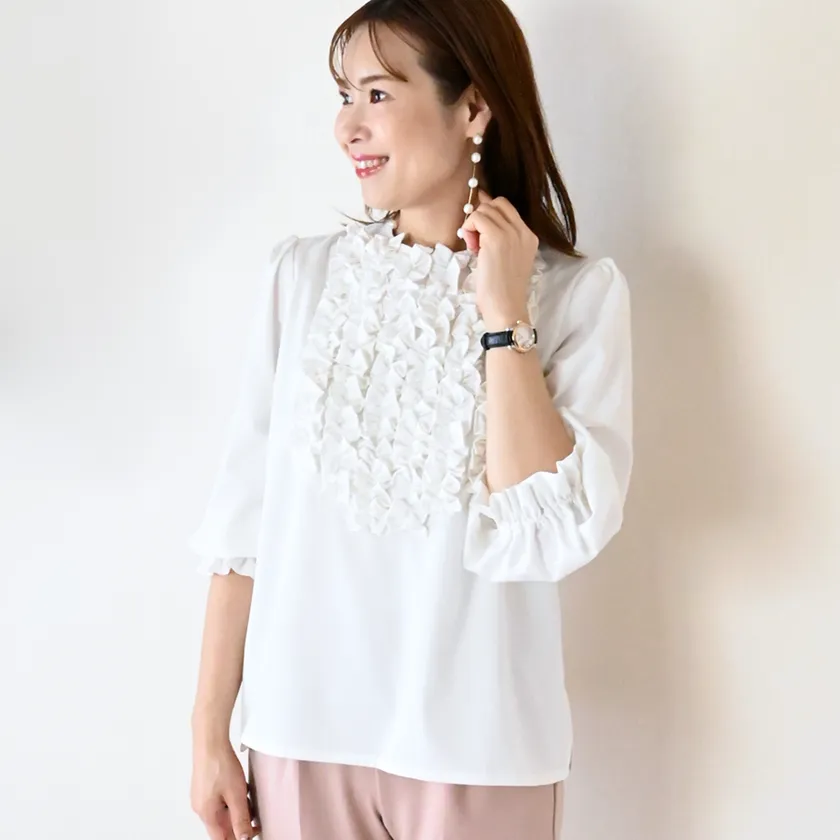 プチフリルがたくさん施されたブラウスは1枚で華やぐ女性らしいデザイン。