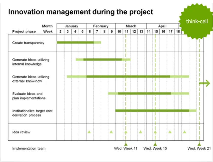 ● データ更新:Think-CellはExcelとのリンクを維持し、データが変更されたときにチャートを自動的に更新します。頻繁に更新されるプレゼンテーションにとって、これは大きな時間節約となります。