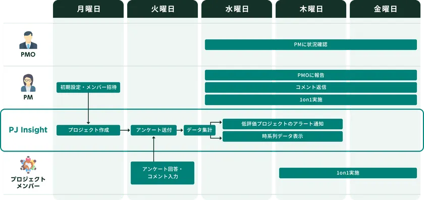 プロジェクトの状況や炎上の兆候となる課題に対し、いち早く気づいているのは現場のメンバーです。そのため、PJ Insightは週に1回のアンケートを通じて現場メンバーの声を収集し、そのデータを元にプロジェクトの状況を可視化します。これにより、従来の進捗報告手法では見過ごされがちなメンバーの本音や不安を把握し、プロジェクトの進捗や課題を的確に把握することが可能となります。