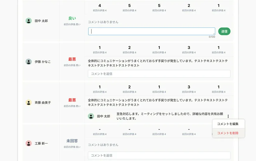 PMはメンバーからの回答を個別に確認し、コメント機能を使って課題に対する対応策を記録・伝達することができます。