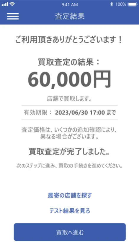 買取査定アプリで簡易査定後に、ゲオの5店舗に設置している自動外装査定端末で外装チェックを自動で行い、店舗の買取カウンターで最終的な買取価格を提示するパターンです。外装チェックまで完了するため、店舗の買取カウンターでお待ちいただく時間が更に短縮されます。