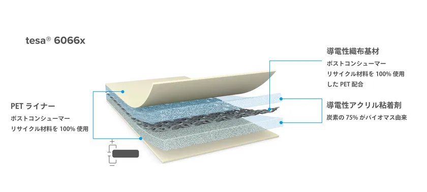 tesa(R) 6066xシリーズは、導電性織布基材にバイオマス由来の導電性アクリル粘着剤を塗工した両面粘着テープです。導電性織布に含まれるPETとダブルライナーにはポストコンシューマーリサイクル材料 (PCR) を100%使用しています。また、粘着剤に含まれる炭素のうち75%はバイオマス由来で、再生可能な自然素材を原料としています。