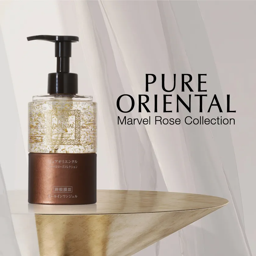 「ピュアオリエンタル M オールインワンジェル」は、卵殻膜をはじめ、植物幹細胞、プロテオグリカン、フラーレン、3種のヒアルロン酸、3種のペプチド(*2)などの美容成分がしっかりと入っているだけでなく、金(箔)、銀・プラチナ・真珠(全てエキス)などの宝石成分が豪華に配合されており、優しいオリエンタルローズの香りに包まれながらワンステップでラグジュアリーなスキンケアを叶えるオールインワンジェルです。