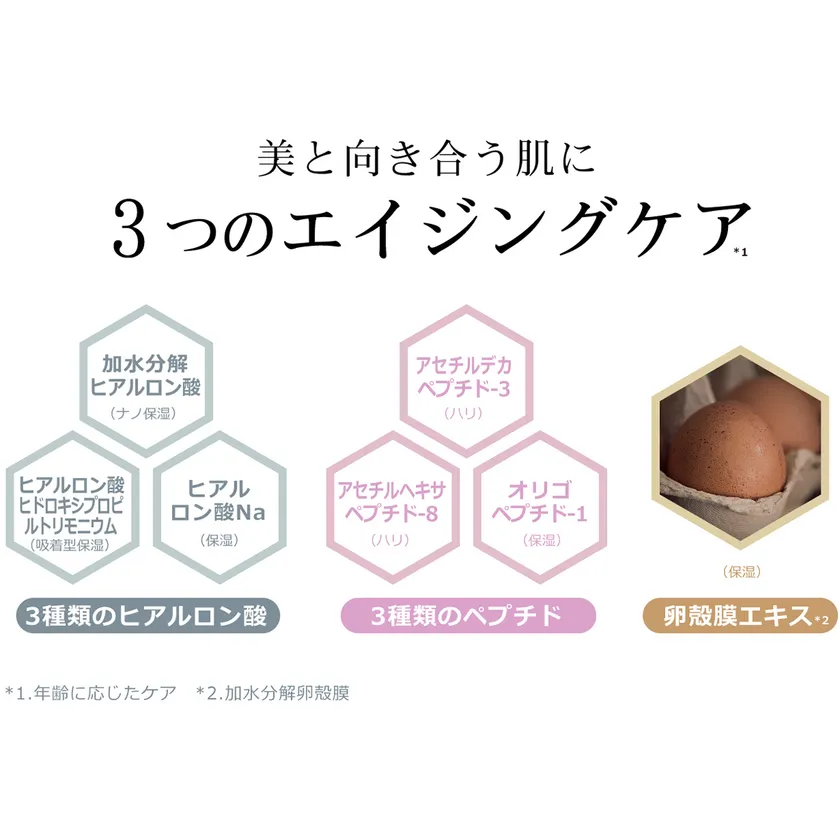 *2 水溶性プロテオグリカン(キメを整える)、加水分解卵殻膜・フラーレン・ヒアルロン酸・リンゴ果実培養細胞エキス(保湿)、ペプチド(保湿・ハリ)