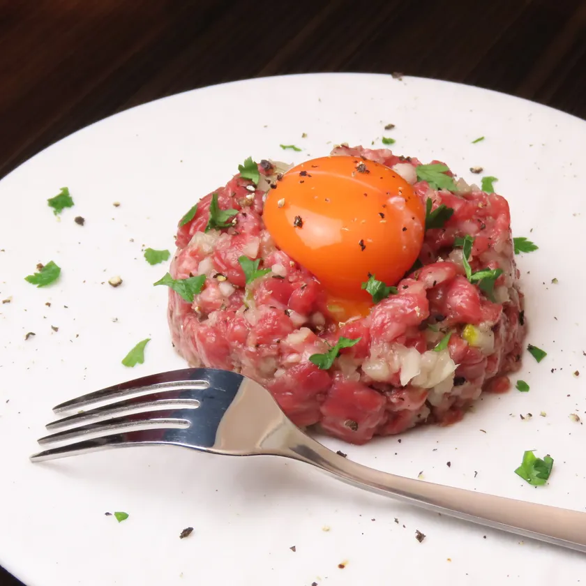香り高く口溶けのよい脂質と旨味の強い赤身とのバランスが絶品の黒樺牛を生ハンバーグに。「生食認可店」だからできる最高の一皿をご堪能いただけます。