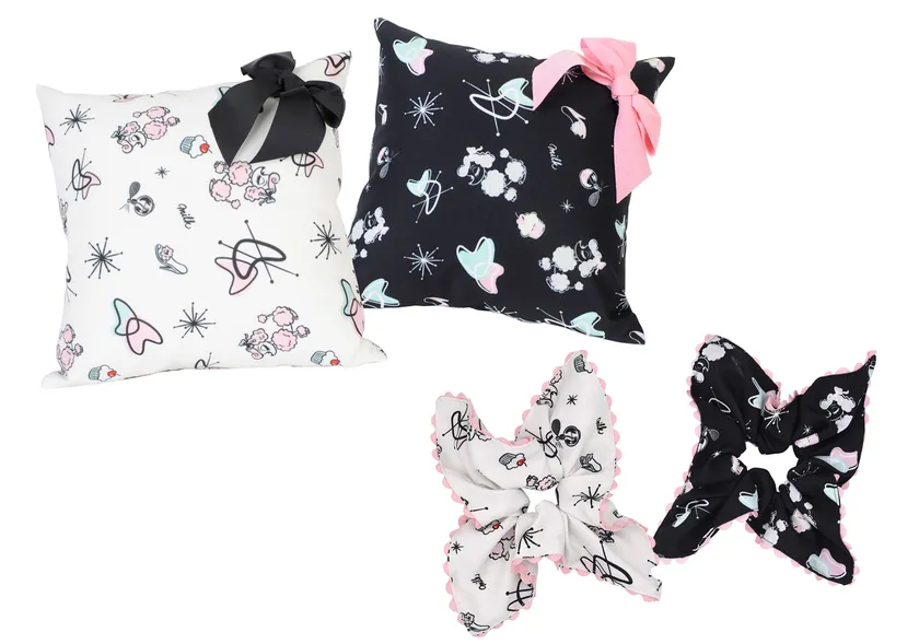プードルの女の子Bonnyと彼女を取り巻く可愛いアイテム、スターバーストやアトミックのモチーフなどを散りばめたコミックイラスト風のテキスタイルで仕上げています。