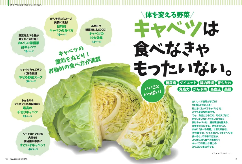 糖尿病・ダイエット・腸内環境・胃もたれ・免疫力・がん予防・高血圧・美肌、と良いこといっぱいのキャベツを徹底解説!身近な食材だからこそ続けやすい“キャベツ”の大特集です。
