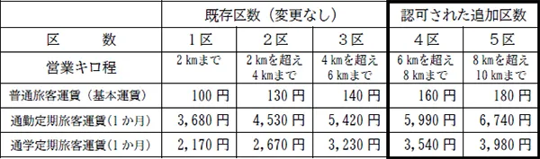 南北線延伸線の普通旅客運賃並びに定期旅客運賃(基本運賃)は現行運賃を適用し、南北線延伸線の開業に伴い現在の営業キロ程を超える区間(4区、5区)の旅客運賃について、以下のとおり認可されました。