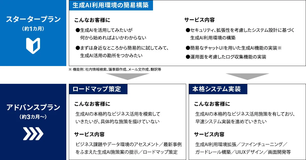 スタータープランのご利用を通じて生成AI/LLM活用の勘所をつかんでいただいたお客様向けには、ネクストステップとしてのアドバンスプランをご用意しております。本プランは、生成AIの本格的なビジネス活用施策を具体化する「ロードマップ策定」、施策を実行に移す「本格システム実装」の2種類をご用意しており、お客様の状況に合わせてご選択いただけます。