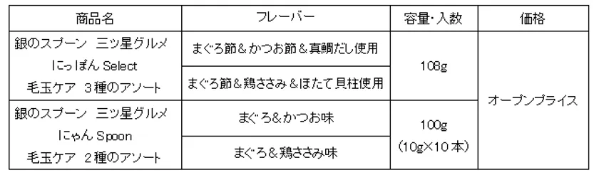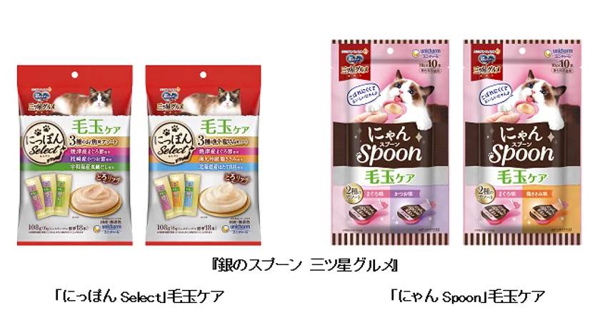 そこでこのたび、このような健康意識の高まりにお応えするべく、『銀のスプーン 三ツ星グルメ』の「にっぽんSelect」と「にゃんSpoon」から、毛玉ケアを全国で発売します。