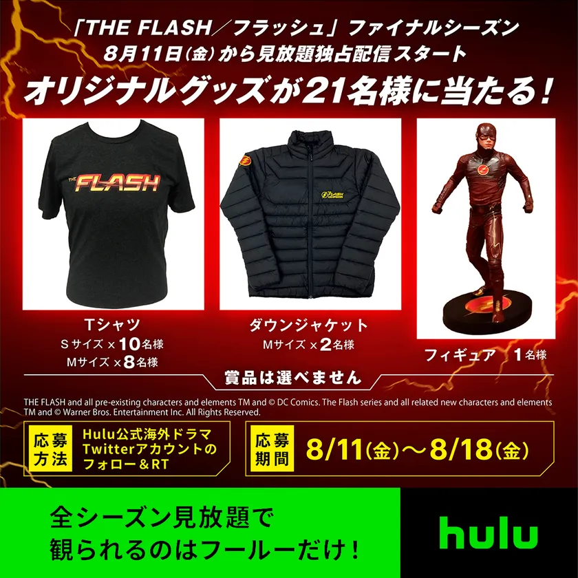 今回の配信開始にあわせ、オンライン動画配信サービスHuluでは、フラッシュ関連グッズが当たるプレゼントキャンペーンを配信開始日の2023年8月11日(金)から実施します。詳細は、下記URLをご覧ください。