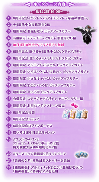 『6周年記念キャンペーン』を開催予定!6周年記念イベント『パラダイスシフト~帰還の物語~』や『期間限定 悪魔ほむら ピックアップガチャ』『毎日1回10連ピックアップガチャ無料』「6周年記念福袋」の販売などの豪華施策を開催予定!