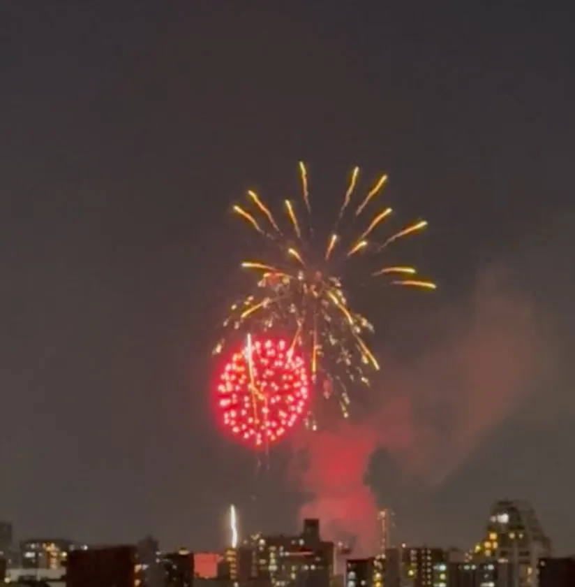 第二部(19時~20時半)の隅田川花火大会は、クリエイティブハウス文花の屋上で行われ、遮るもののない空間で参加者一同が美しい花火を堪能しました。混雑を回避しながら花火を楽しむことができ、東京スカイツリーや東京ソラマチのビルと共に眺める花火の輝きが素晴らしい光景となりました。