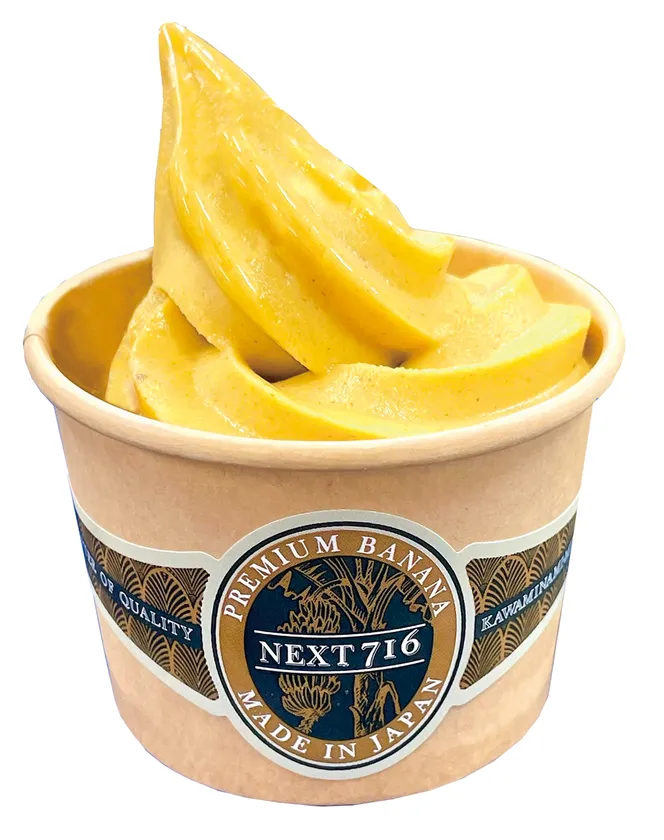 宮崎産・皮まで食べられるバナナ「NEXT716」を使用したソフトクリーム。希少な国産バナナにしか出せない「濃厚な味と香り」が特徴。