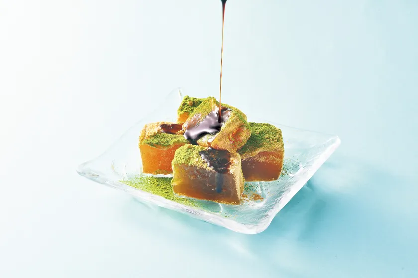 奄美大島産100%さとうきびを原料にした純生黒糖を使用したわらび餅。黒糖と国産わらび粉を通常の3倍以上の時間をかけて練り込み、空気を多く含ませることでとろけるような独特の食感が楽しめる。東武限定で爽やかな香りが特徴の月桃をトッピング。