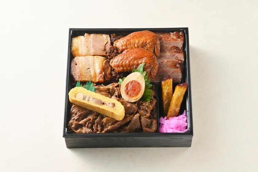 鹿児島黒豚の角煮、鹿児島黒毛和牛サーロインステーキ、黒毛和牛牛すき、黒さつま鶏の手羽煮と鹿児島県が誇る「黒」の豪華共演弁当。