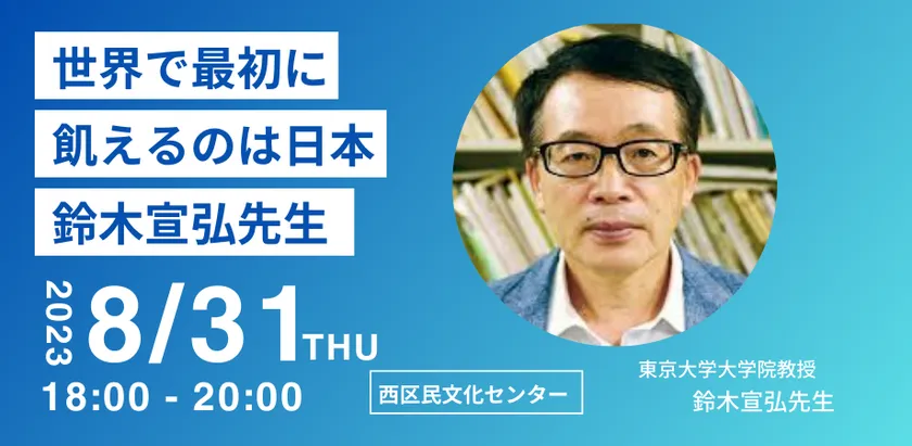医療法人つぐお会 フジハラレディースクリニック(所在地:広島県広島市安佐南区、理事長・院長:藤原紹生)は、東京大学大学院 教授 鈴木宣弘先生をお迎えし、「今の食の現状について」をお話いただく講演会『世界で最初に飢えるのは日本』を広島市西区民文化センターで2023年8月31日(木)に開催いたします。