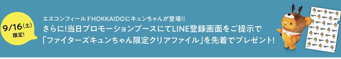 2023年9月16日(土)はエスコンフィールドHOKKAIDOに北海道観光PRキャラクターキュンちゃんが登場!当日はスタジアム内ブースにて、キュンちゃんとファイターズがコラボした限定デザインのクリアファイルを配布します。