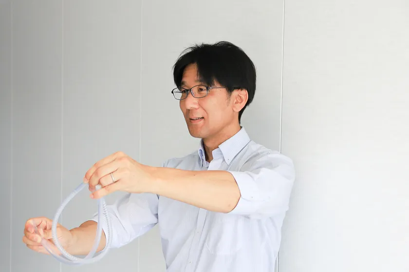 スパイラル加工を施したハイバリアPFAチューブを手にする担当者