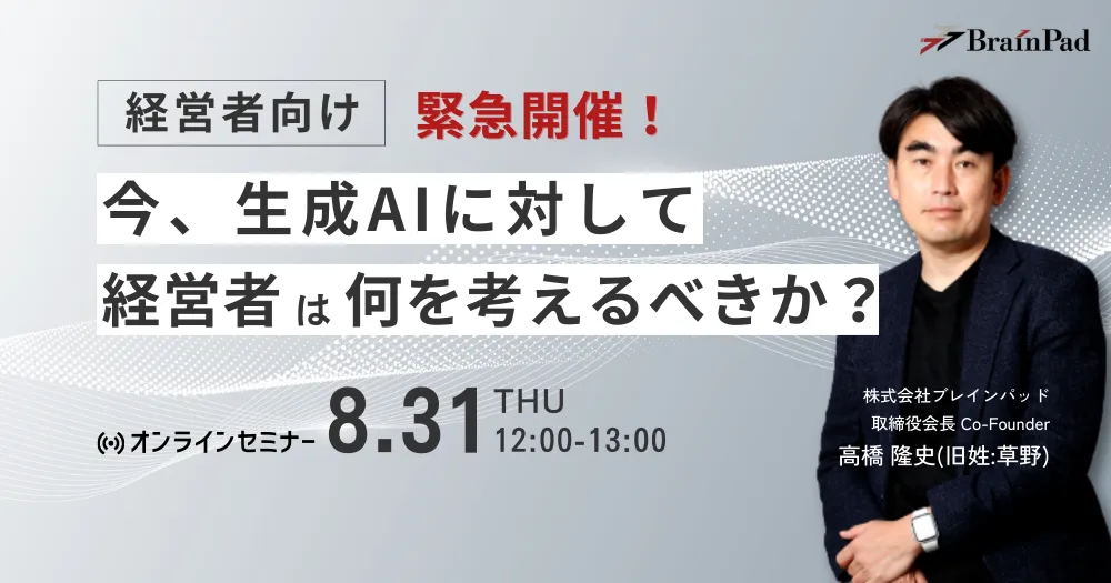 株式会社ブレインパッドは、本年8月10日に発表した当社の新サービス「生成AI/LLMスタータープラン」(*1、*2)の提供開始を記念し、経営者向けセミナー「今、生成AIに対して経営者は何を考えるべきか?」を開催いたします。
