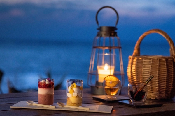圧倒的な絶景とスケールを誇る海カフェ「星野リゾート バンタカフェ」では、2020年12月1日から2021年2月28日の期間に、夜の海をライトアップする「イルミーバンタ」を開催します。昼夜を通して過ごしやすい冬の沖縄で、3密を避けながら楽しめる屋外のイベントです。バンタカフェの前に広がる海がライトアップされ、夜の闇に青く輝く入り江が浮かび上がります。次々と打ち寄せる波は白く輝き、その時だけの情景を創り出します。また、海のライトアップと合わせてカフェエリアも期間限定で夜の営業を行い、海辺の散策と共に楽しめる限定メニューを販売します。