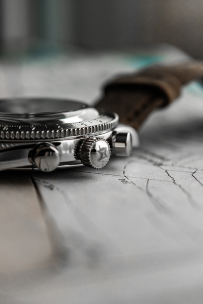 3つのインダイアルを備える通常のクロノグラフから12時間積算計を除いたツーカウンタークロノグラフ。スモールセコンドと30分積算計を3時・9時位置に配置し、6時位置に日付を表示するシンメトリーデザイン。軍用時計を起源としていることから、機能性と視認性の両立を実現しています。
