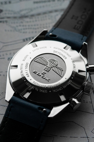 厚みのある高硬度サファイアクリスタルを、美しい曲線を描くドーム型に加工し、当時さながらのレトロな表情に。現代版のアレンジとして、ねじ込み式の裏蓋にパラシュート部隊のモチーフとエドックスのロゴを刻印。