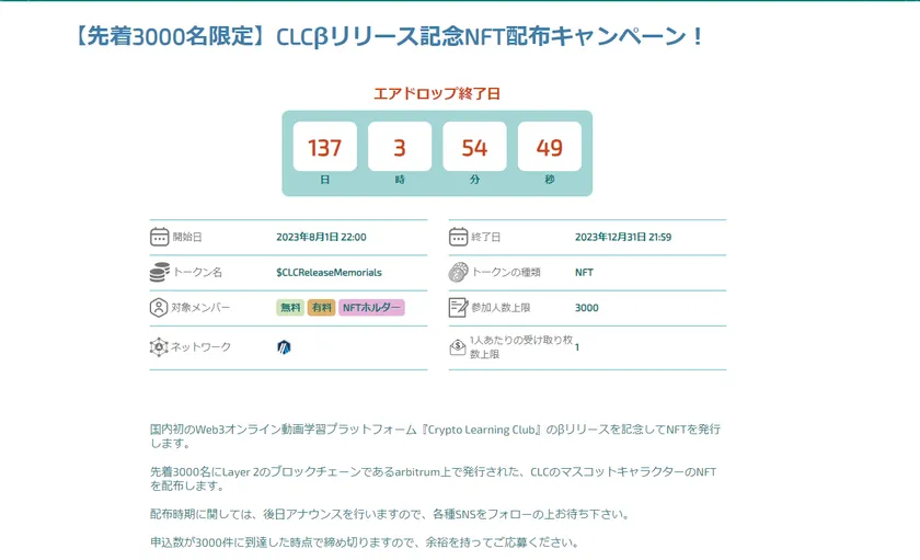 Crypto Learning Clubの運営を行うCLC株式会社(所在地:東京都江戸川区、代表:山本 次郎)は、Web3を学びながらトークンやNFTを獲得できる新サービス「Crypto Learning Club(CLC)」のβリリース記念として、CLCマスコットキャラクターのNFTを発行し、先着3,000に配布するキャンペーンを2023年8月8日に開始しました。本キャンペーンは12月31日まで実施いたします。