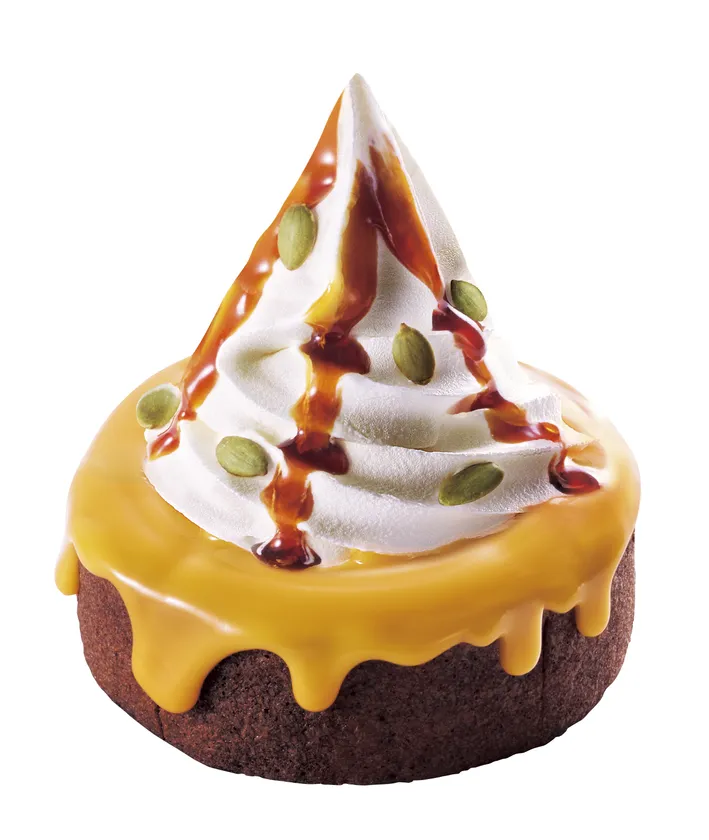 ココアバウムクーヘンの上から、パンプキンソース、ソフトクリーム、カラメルソースをまとわせ、トッピングにパンプキンシードをあしらいました。ココアの香りとカラメルソースのほろ苦さが、パンプキンソースの自然な甘みを引き立たせます。見た目も味も秋らしい、今だけのクロネージュをお楽しみください。
