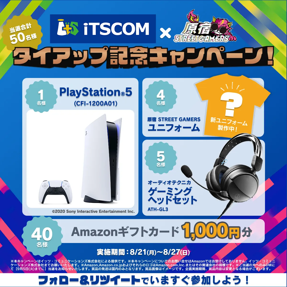 ■賞品:PlayStation(R)5 1名様、原宿STREET GAMERSユニフォーム 4名様 、ゲーミングヘッドセット 5名様、Amazonギフトカード1,000円分 40名様