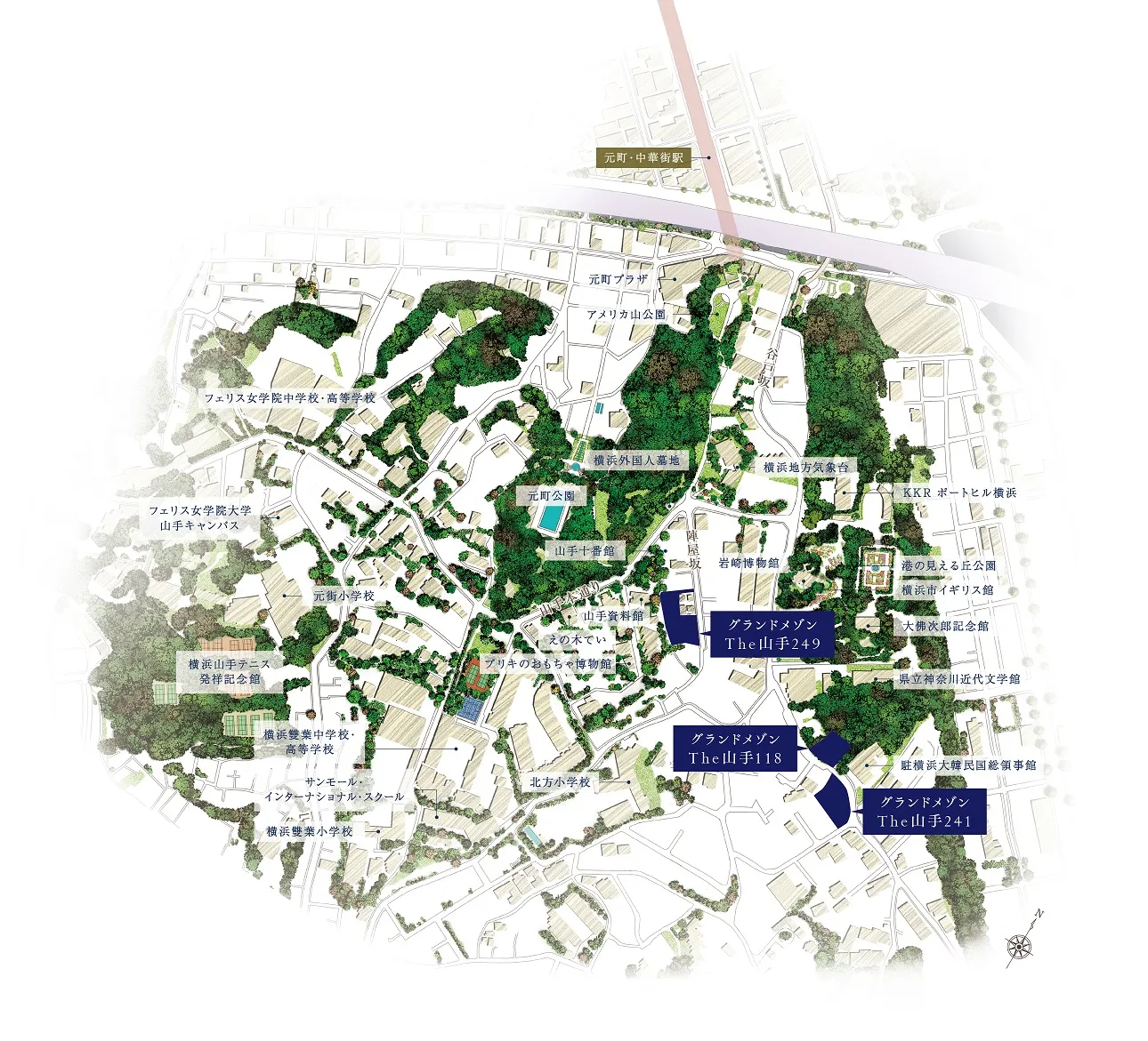 「グランドメゾンThe山手118」は、港が見える丘公園の懐深くの豊かな杜に抱かれる地に誕生する、街並と調和し緑と融けあう建築が特長です。全7戸すべてを角住戸とし、どの住戸からも緑が見えるようプランニングしています。山手の街並みと共に育った三本の桜をシンボルツリーとして継承し、街の歴史を未来へ繋いでいきます。