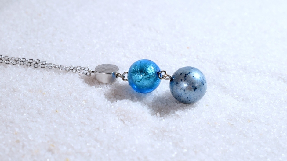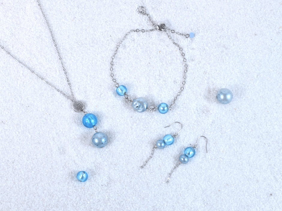 また、イタリア語では真珠もガラスのビーズも共に「Perla(ペルラ)」と呼びます。今回のMakuakeのプロジェクトでは、同じ青でも異なる色合いのコントラストが映えるペルラのペンダント、ピアス、ブレスレットの3点を公開しています。