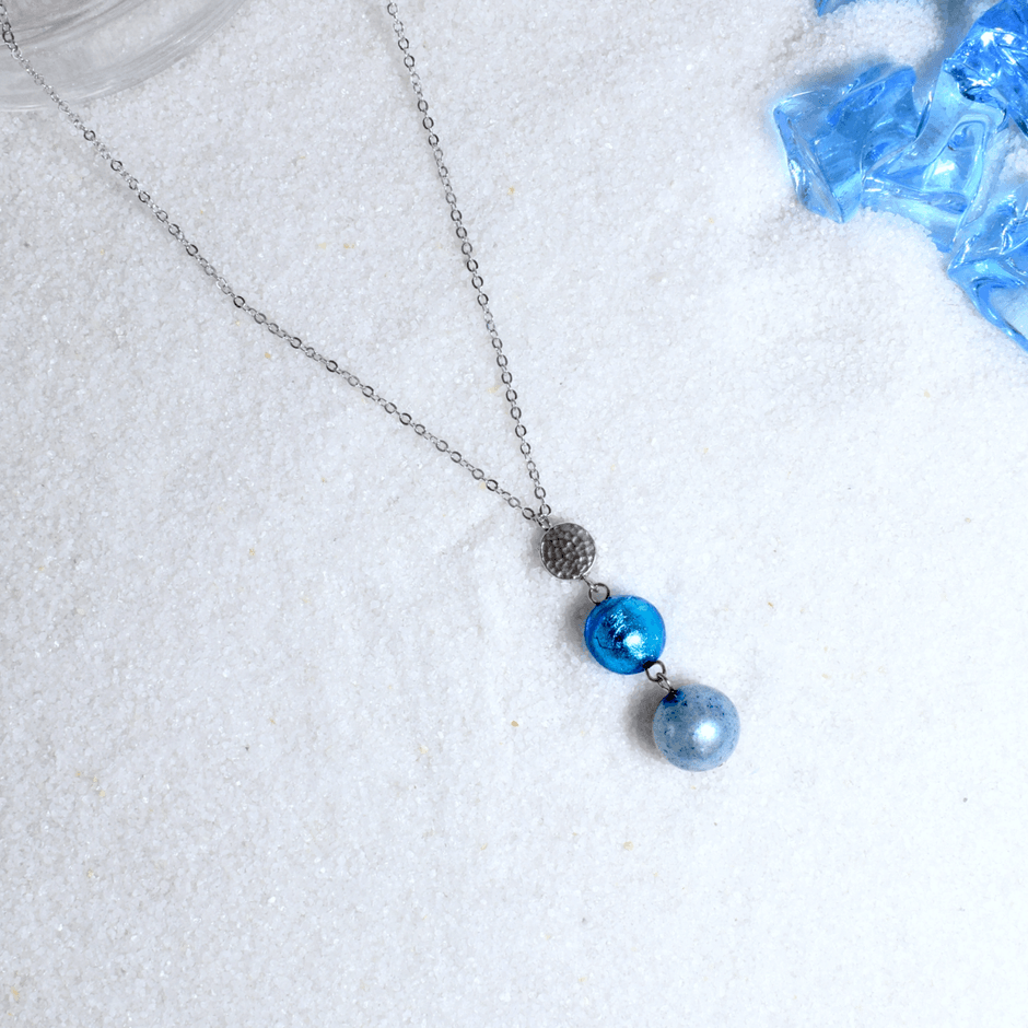 ペンダントは槌起模様のシルバーのチャーム、爽やかなブルーのヴェネチアングラス、淑やかな藍パールを組み合わせた3連タイプで、揺れるとそれぞれ異なる輝きで華やかさを演出します。