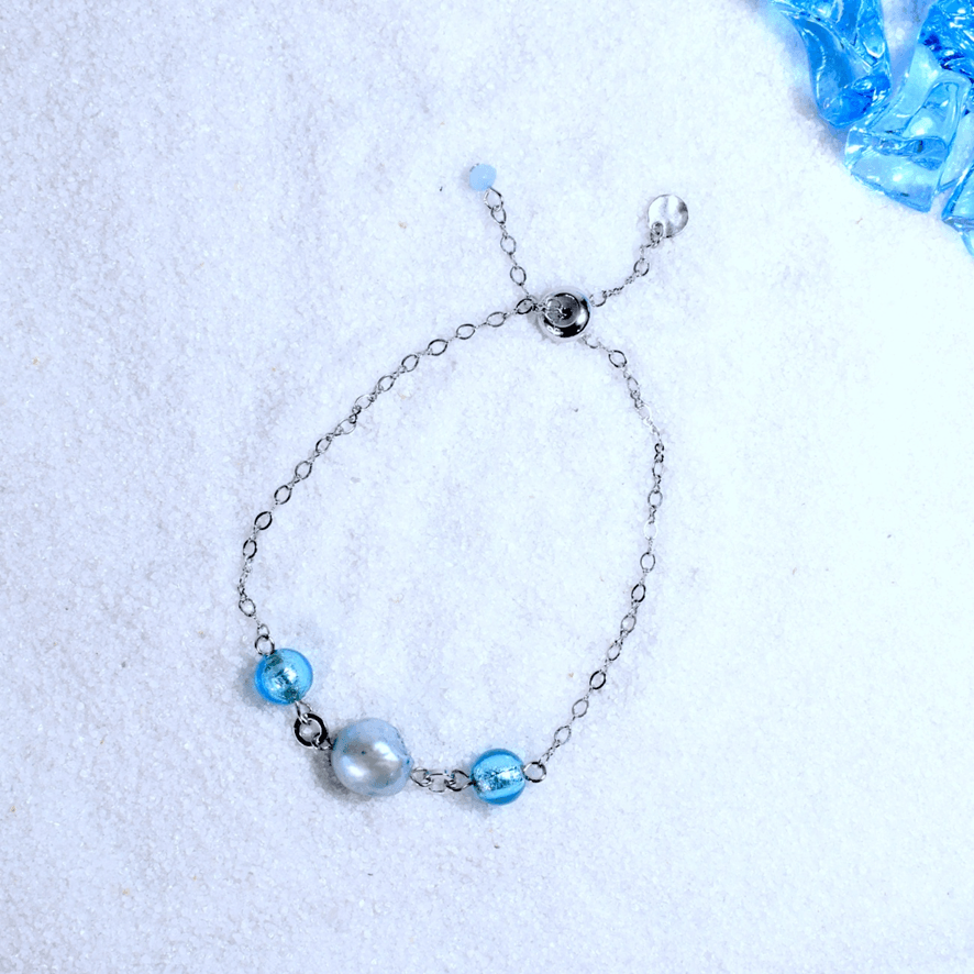 ブレスレットは形が不揃いで同じものは一つと無いバロックの藍パール※の左右に8mmのヴェネチアングラスを配したチェーンタイプで、アジャスターでサイズ変更ができ、余ったチェーンが揺れ手首回りのお洒落もワンランクアップします。
