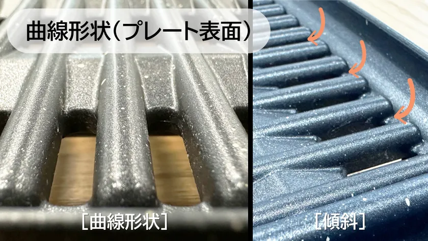 プレートの表面(焼き面)を曲線形状にすることで、より油が下に流れやすいようにしました。また、これまで油が溜まりやすかったプレートの縁の部分には、傾斜をつけることで油が下に落ちやすくなるようにしました。