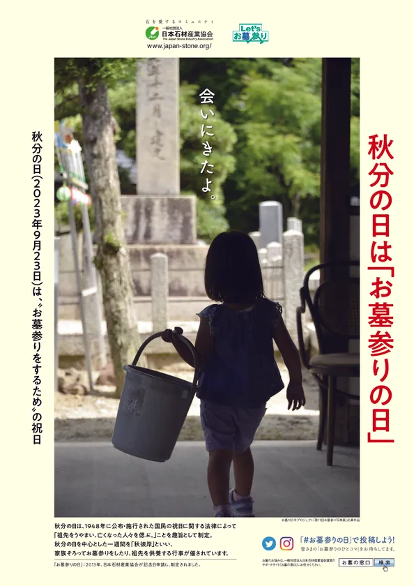 石材業界最大の全国団体である一般社団法人日本石材産業協会(以下「石産協」)は、2023年9月23日(土・祝)の「秋分の日」に向けて、石産協が制定した「秋分の日はお墓参りの日」の更なる認知度向上を図り、お墓参りの啓発策の一環として「秋分の日はお墓参りの日」のポスター約4,000枚を協会員の店頭や、お寺、学校、生花店などへ掲出し、各協会員のSNSアカウントからも情報発信を行うことで、その啓発活動を促進しています。