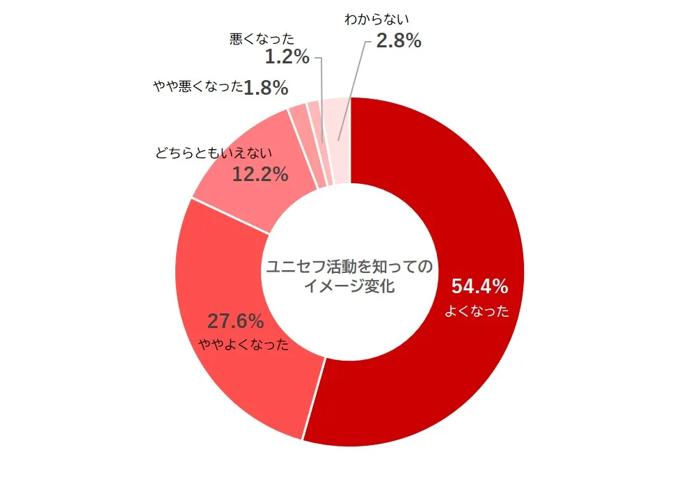 一方、オードリー・ヘプバーンが晩年行ってきたユニセフでの活動に関する調査では、全体の半数以上が「全く知らなかった」「知らなかった」と回答(グラフ9)。活動の様子や写真を見せた後で改めてオードリー・ヘプバーンへのイメージがどう変化したか調査すると、「よくなった」「ややよくなった」と回答した人が80%を超えることが分かった(グラフ10)。