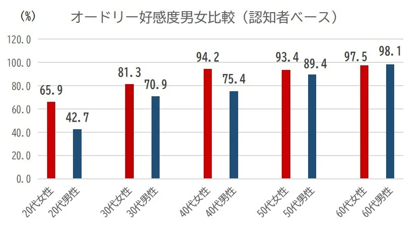 女性全体の約86%にあたる「オードリーを認知している女性」のうち約86%が「好き」と回答し、中でも40~60代女性における好感度は90%を超えた。