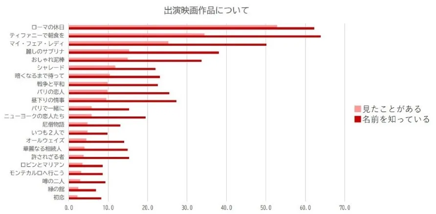 また、「オードリー・ヘプバーンにどのようなイメージを持っているか?」という質問(グラフ7)では「上品」が1位、続いて「エレガント」「華麗」「清潔」となりました。また、出演作品に関する調査(グラフ8)では最も名前が知られている作品は『ティファニーで朝食を』、実際に見られている作品は『ローマの休日』でした。
