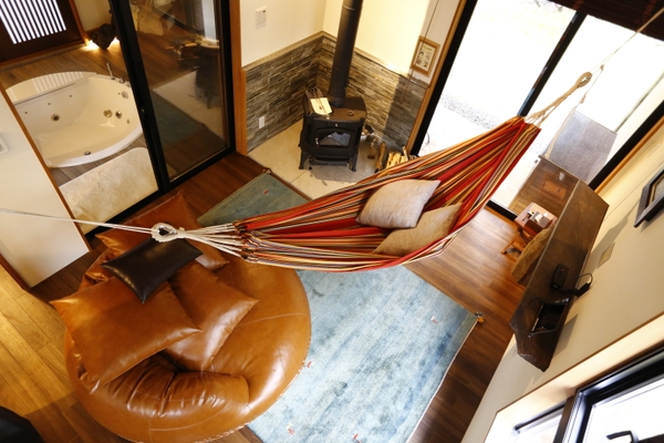 室内にはシュラフやハンモック、テラスにはアウトドアリビングが広がり、1日を通して非日常をご体験いただけます。