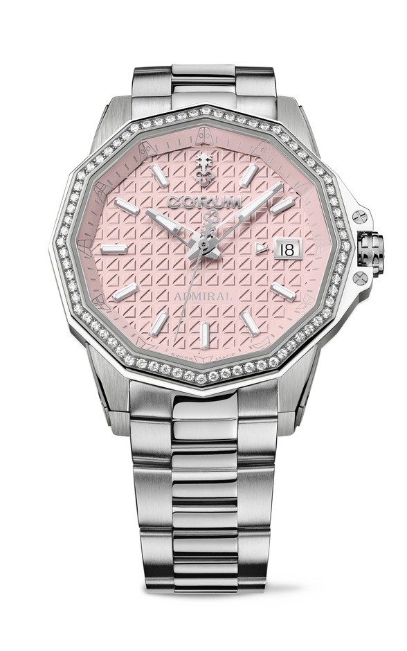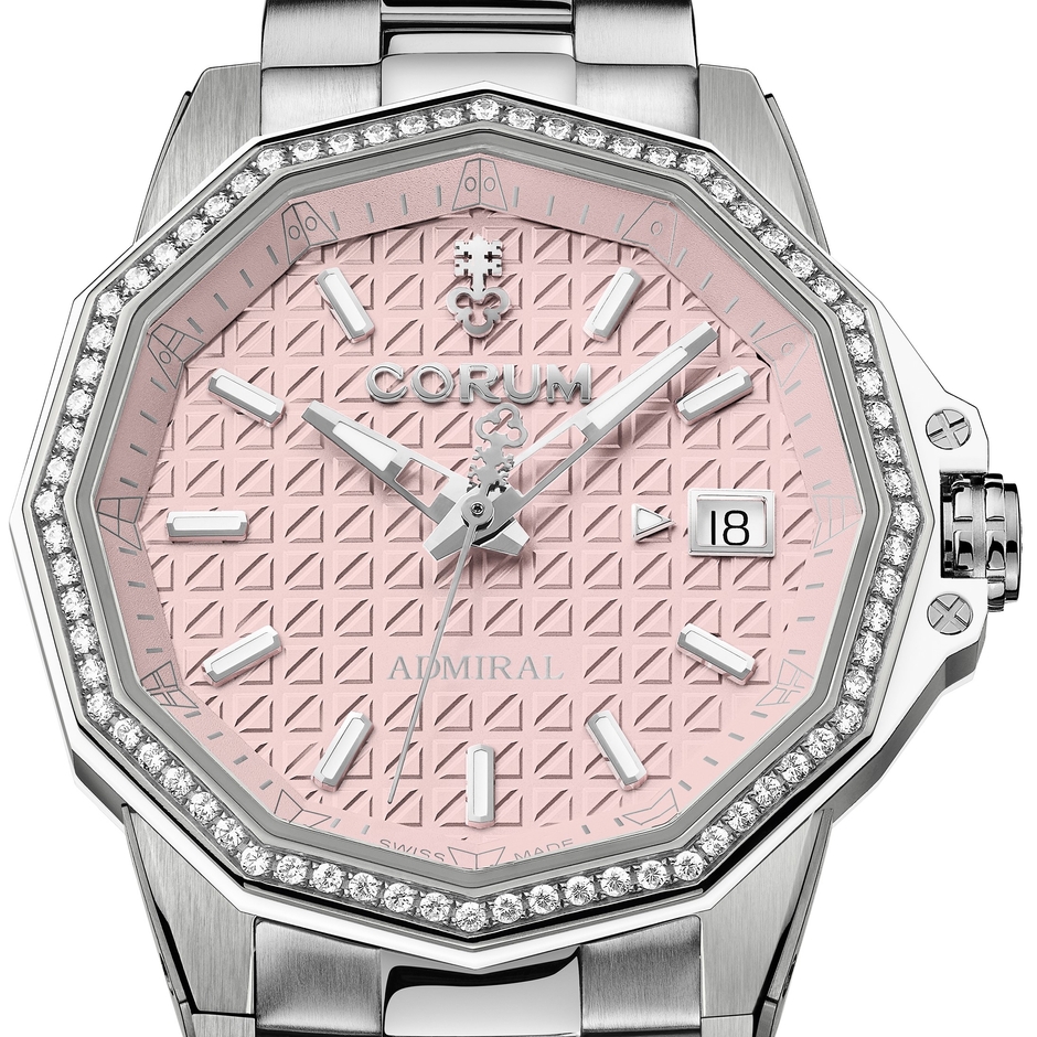 12角形ベゼルに72石のラウンドカットダイヤモンドをセット。フランジに描かれた国際信号旗や、ヨットの帆を模したエンボス加工を施したピンク文字盤、12時位置の鍵のシンボルは、他の時計では味わえない、ユニークでファッション性の光るデザインです。世界限定150本。