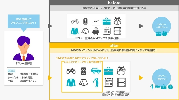 これにより、広告会社は与件や商材と親和性の高いMDC独自のメディアレコメンドを受けることができ、与件に応じた魅力的なメディアとの出会いとコミュニケーションを創出することが可能となります。