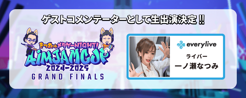 ライブ配信アプリ「everylive」内のイベントを勝ち上がり、オフラインイベントへの出演権を獲得したライバー、一ノ瀬なつみさんが「きつねのメタゲーNIGHT! AiMJAM Cup 2024-2025」グランドファイナルのゲストコメンテーターとして出演します。