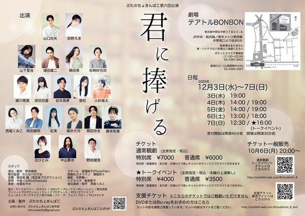 ぶたのちょきんばこ主催、『君に捧げる』が2025年12月3日 (水) 〜 2025年12月7日 (日)にテアトルBONBON(東京都 中野区 中野 3-22-8)にて上演されます。 チケットはカンフェティ(運営:ロングランプランニング株式会社、東京都新宿区、代表取締役:榑松 大剛)にて発売中です。