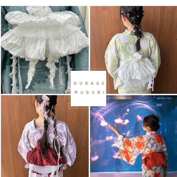 8月20日よりこのクラゲ浴衣にぴったりのキュートなオリジナルクラゲ帯結びをレース帯揚げとセットで1,100円でご提供します!浮遊感溢れる瑞々しく可愛いクラゲ帯結びをこの期間に試してみてください!