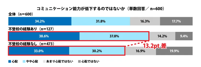 まずは、もしお子さまが不登校となり、学校を休むことになった場合、各項目についてどの程度心配になるかをお聞きしました。その結果、どの項目も半数以上が「心配」「やや心配」と回答する結果となりました。自身の不登校経験で比較をすると、不登校の経験がある方が10ポイント以上多く回答しています。自身の経験により、不安視する声が多いのではないでしょうか。