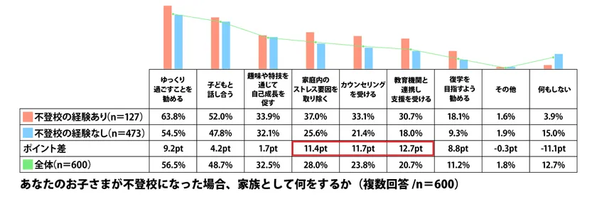 もしお子さまが不登校になった場合、家族として何をするかを聞くと、最も多い回答は「ゆっくり過ごすことを勧める」となり56.5%が回答しました、とくに不登校経験者は63.8%が回答しています。自身が求めていたことなのかもしれません。ポイント差が高かった項目は「家庭内のストレス要因を取り除く」「カウンセリングを受ける」「教育機関と連携し支援を受ける」となっています。