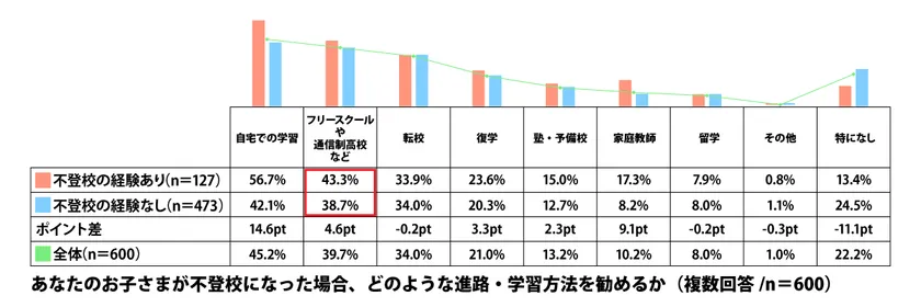 もしお子さまが不登校になった場合、どのような進路・学習方法を勧めるかを聞くと、「自宅での学習」が最も多く45.2%となりました。次いで「フリースクールや通信制高校など」と続く結果となっています。「フリースクールや通信制高校など」は不登校の経験の有無にかかわらず高い結果となっており、全日制の学校に通う以外の選択肢を持ちやすくなっているのではないでしょうか。